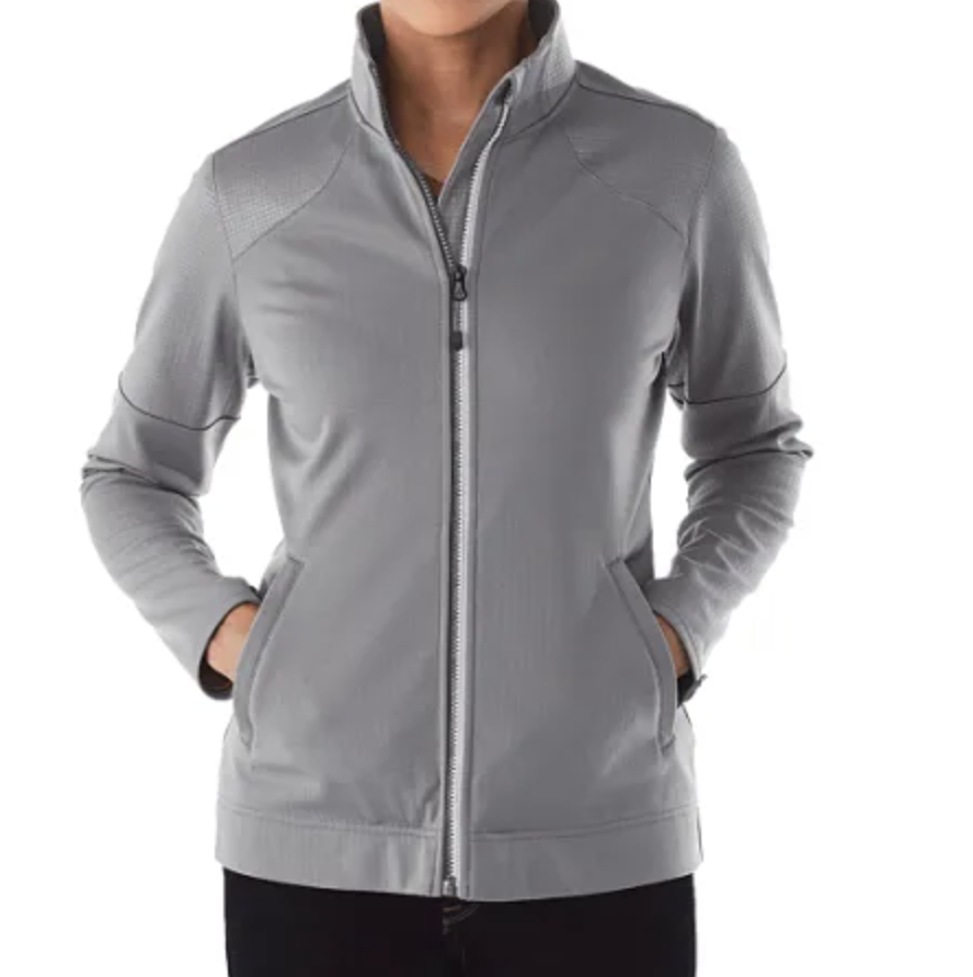 SENGER Women’s Knit Jacket. Subtle graphic detail on the shoulders for a little extra style. It’s easy to see why everyone loves it. Thumb exits for easy layering. Interior media pocket and earbud port for music on the move. Women’s style shaped and tailored for a flattering fit. 100% Polyester interlock knit bonded to 100% Polyester brushed grid pattern knit.